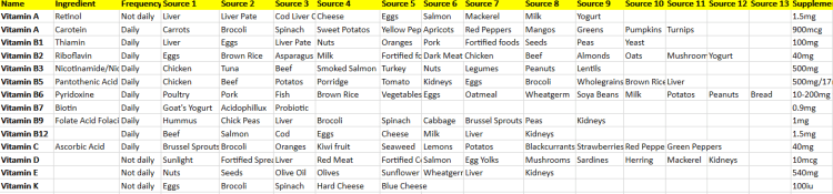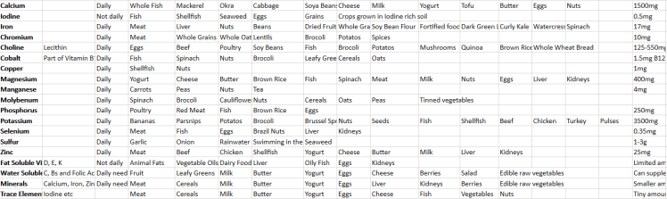Here are the spreadsheets of vitamins and minerals with their foods. The meals above provide all these micronutrients: