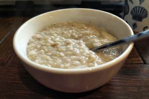 Method – Saucepan. Half cup oats. 1.5 cups water. Pinch salt. Minimum effort – put pan on regular heat on hob. Wait til bubbles. Turn to lowest heat and stir and leave for 5-10 mins to preferred texture.