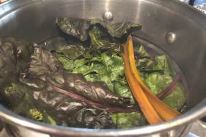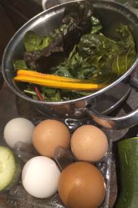 Steamed greens – Saucepan and steamer. Boiling water under steamer. Add mix of asaparagus, chard, kale, brocoli, spinach, sprouts, cabbage, leaks, spring greens to steamer. Takes around 5 minutes to cook. Anti-oxidants. Vitamin C.